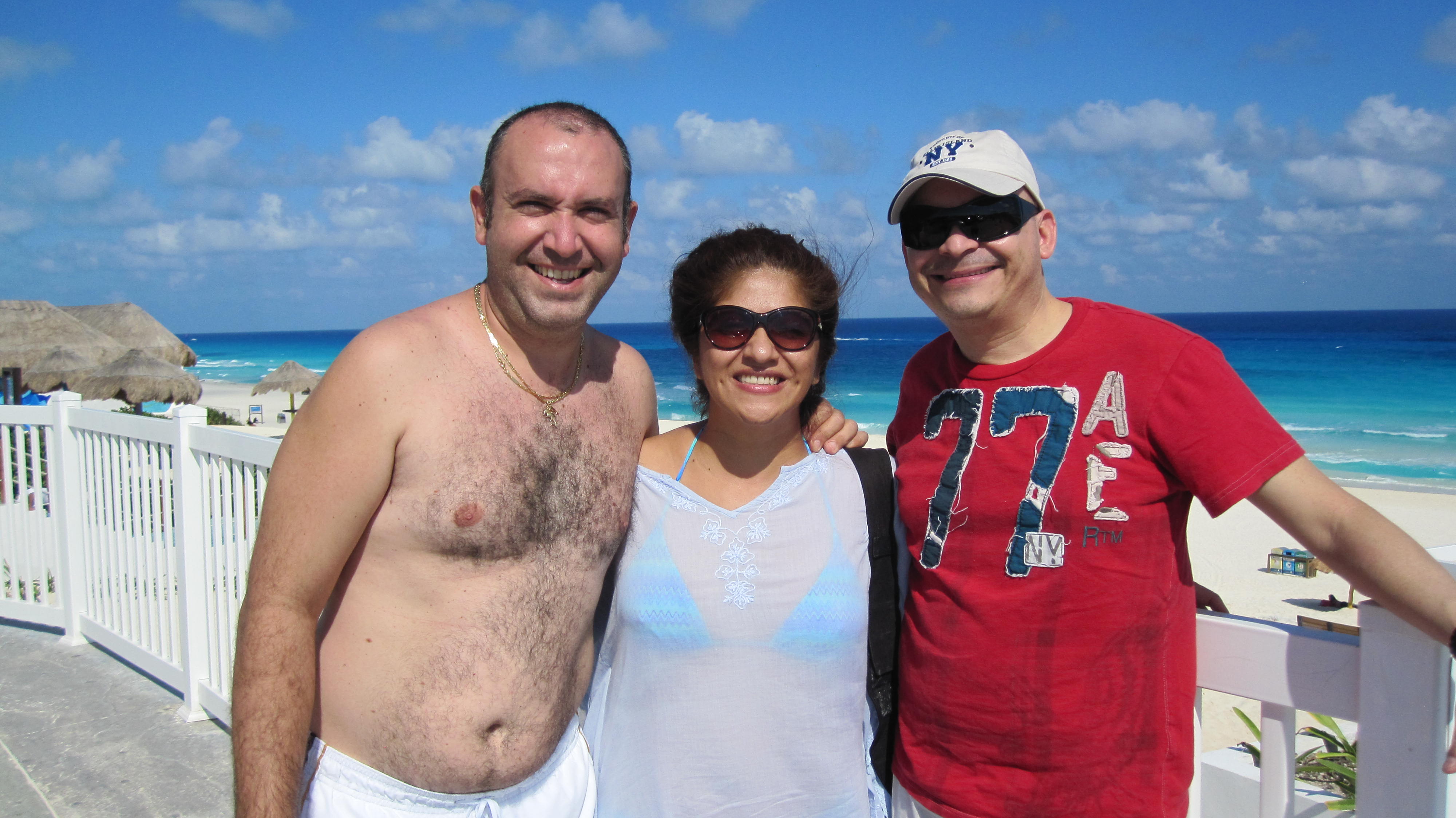 IMG_6965Nos fuimos derechito hacia su casa, me cambié rapidito (dejé todo el atuendo de abrigos que traía encima pues había salido con 6°C bajo cero) y me puse un short y una camiseta (aunque difícil de creer, me puse un «short» y una camiseta) y acudí al llamado de Cristina Chávez quien había estado marcando al teléfono de Áurea miles de veces. Cristina me esperaba en la playa «El Mirador» en la zona hotelera de Cancún. Llegué en bus y corrí y bajé las escaleras… pude sentir la suave y tibia arena blanca en mis pies y busqué desmesuradamente a Cristina, quien me esperaba junto a su esposo Oscar Mercatelli, en un camastro bajo el intenso sol dorado caribeño.